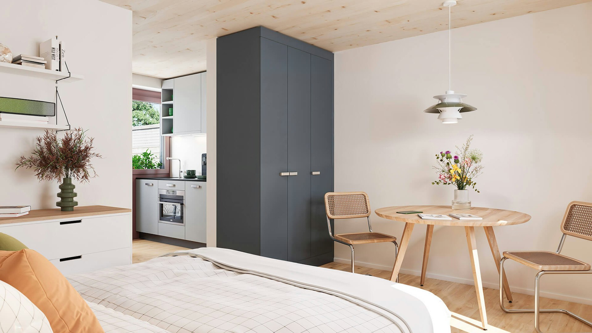 Reduced to the max – MOVEMENT ist ein überraschend cleveres Raumkonzept. Mit verschiebbaren Modulen können unterschiedliche Wohnsituationen geschaffen werden – auf Tastendruck und ganz nach Lust und Laune.